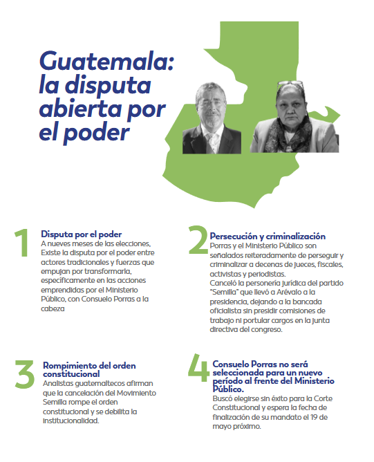 El foco del conflicto es el Ministerio Público encabezado por Consuelo Porras, señalada de perseguir a jueces, fiscales, activistas y periodistas, y “sancionada por más de 40 países, entre ellos Estados Unidos y la Unión Europea”. Su decisión más reciente fue la cancelación de la personería jurídica del partido Semilla, que llevó a Arévalo a la presidencia, lo que —según analistas guatemaltecos citados en el boletín— “rompe el orden constitucional” e introduce “un elemento de desconfianza entre los ciudadanos porque sus votos pueden ser vulnerados después de los procesos electorales”.